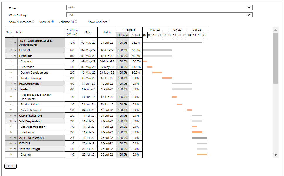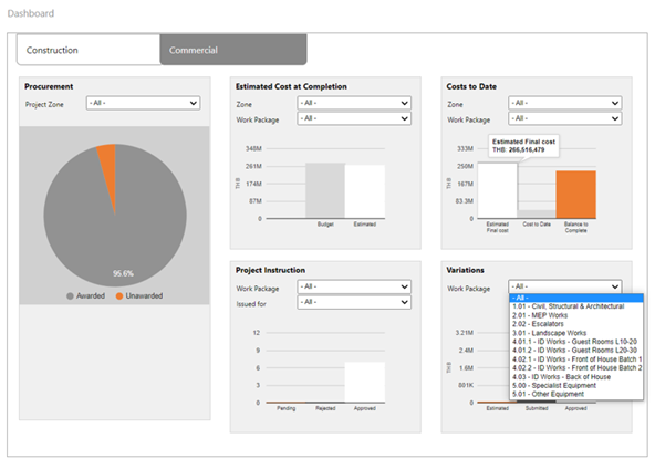 It included document revision history, document approvals, time and cost project control information, processes around issue of construction drawings and bids for work, as well as an ‘at a glance’ dashboard with graphical information.